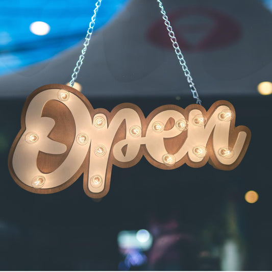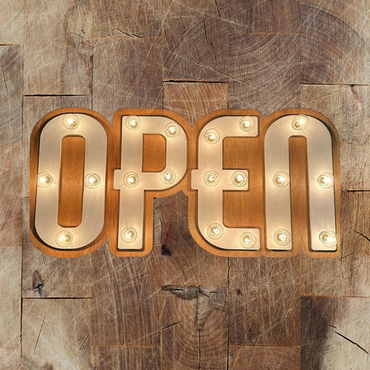 Custom lighted marquee 'open' sign – ideal for boutiques, vendors, or events. handcrafted wood design with bright lights to draw attention!